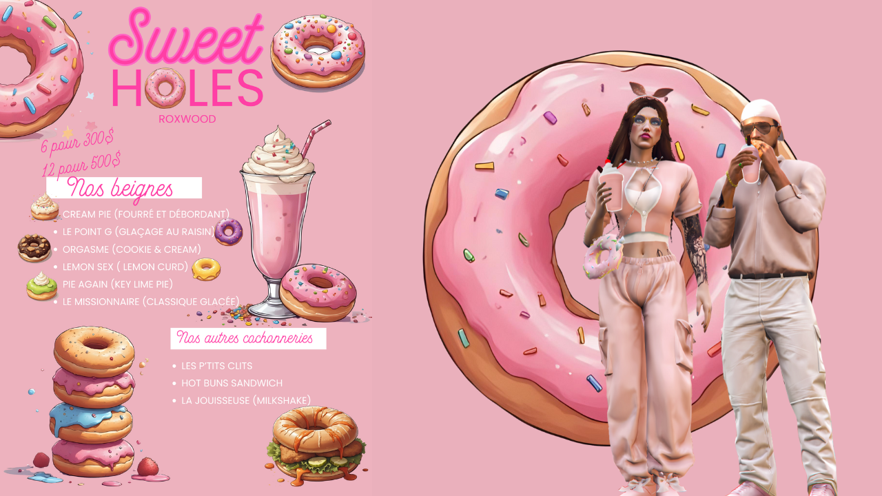 Né à Roxwood d’un désir partagé entre audace et gourmandise, Sweet Holes est un projet signé Duchesse & Cole. C’est plus qu’une beignerie — c’est un clin d’œil à l’irrévérence, à la sensualité et au plaisir sans filtre. Ici, chaque beigne est une expérience, chaque glaçage un flirt, chaque bouchée une invitation à jouer.